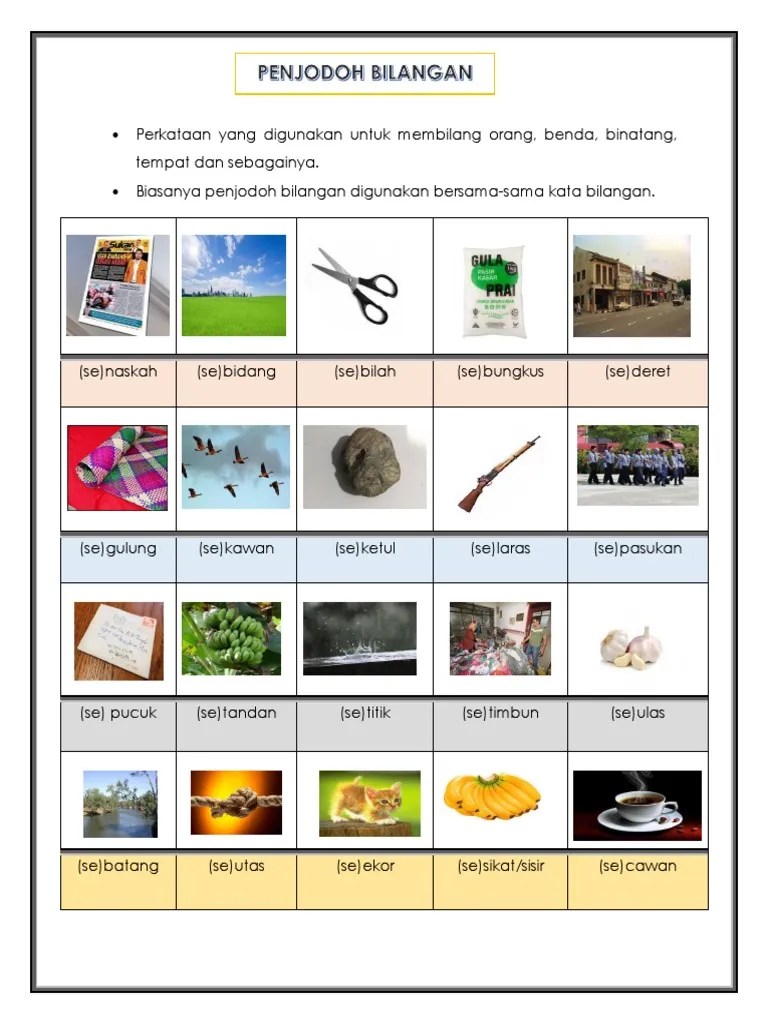 Contohnya polis, tentera, sasterawan, penulis, belia, kapal . Penjodoh bilangan 1 penjodoh bilangan digunakan sebelum sesuatu kata atau nama yang menunjukkan jumlah. Untuk membilang sekumpulan manusia atau benda. Penjodoh bilangan ialah perkataan yang terletak di antara kata bilangan dengan kata nama dalam sesuatu frasa nama.